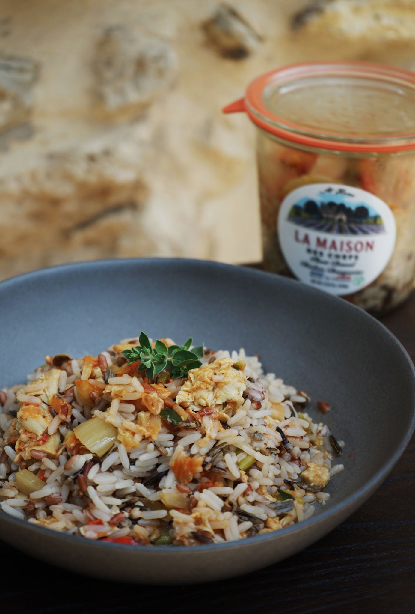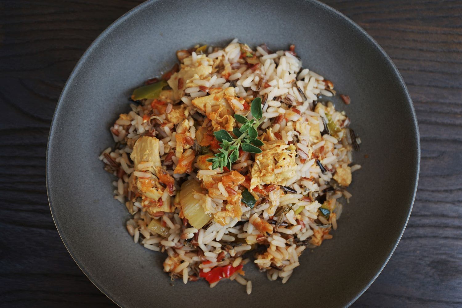 A vegan dish made hearty by the diverse and vibrant flavors of tomatoes, zucchini, peppers, and fennel. These are complemented by delicious plant based chicken and a savory sauce.